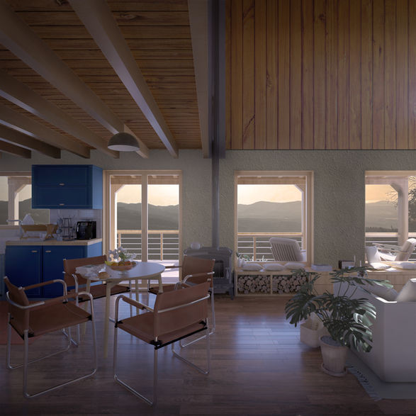 A lime-based plaster is used on the exterior, while earth plaster is applied on the interior. The large glazed openings are designed to enhance both the southern exposure and the surrounding views. Greywater from the bathroom and kitchen is treated and reused for land irrigation through a natural system of gravel beds and reed beds. On the eastern side of the building, a productive vegetable garden is planned for the cultivation of seasonal crops, while almost the entire energy demand of the house is met by the solar panels.