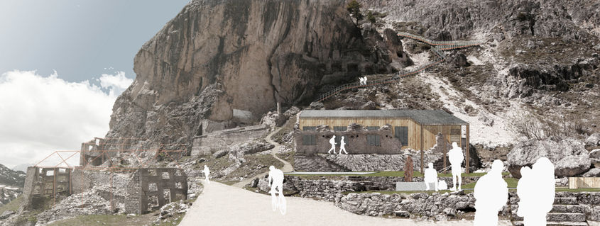 This site expresses one of the strongest and protagonist concepts of this conflict, the relationship between man, nature and a hostile landscape. The walls in front, now a popular destination for climbers, represented fear and fear among soldiers due to natural hazards (such as landslides and landslides). However the same walls worked as an element of protection and cover from enemy attacks.Here the perception of the place is often conflicting within the visitor. The ruins present show can not lead us back to one of the most bloody events in history, but at the same time we cannot but appreciate the landscape and the beauty that surrounds us. From here it is possible to perceive the whole valley towards the Cinque Torri, Vervei and Cortina, moreover if you climb on the rock tooth it is placed between the site and the Piccolo Lagazuoi you get a view of the whole valley (from Cortina to Passo Falzarego ). Within the network of interventions, here the path expands creating new spaces with informative seats and landmarks, in front of the ruins, to then fit into one of these, building a corten, steel and wood mountain shelter that can act as a structure to put in safety the walls (now unstable) and give the opportunity to the users to sleep and stay in this place rich in memory so as to be able to appreciate the historical and at the same time the landscape aspect. Finally, through a branching of these spaces we want to create a metallic staircase and some "gates" to connect the highest point of the rock tooth to the west (now hardly accessible). From here it will then be possible to continue towards the Falzarego Pass and the Great War open air Museum on the Piccolo Lagazuoi.